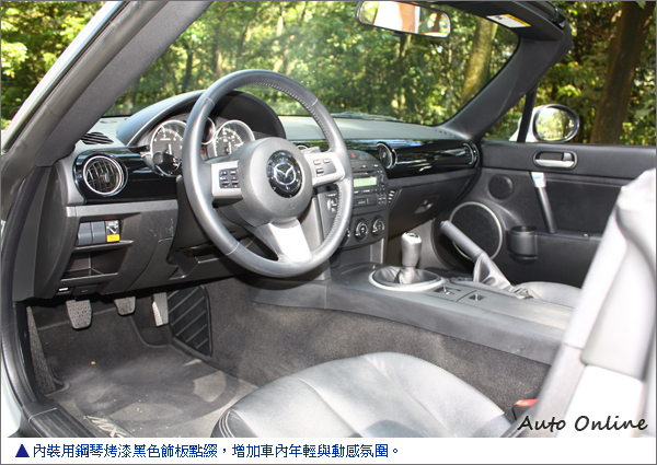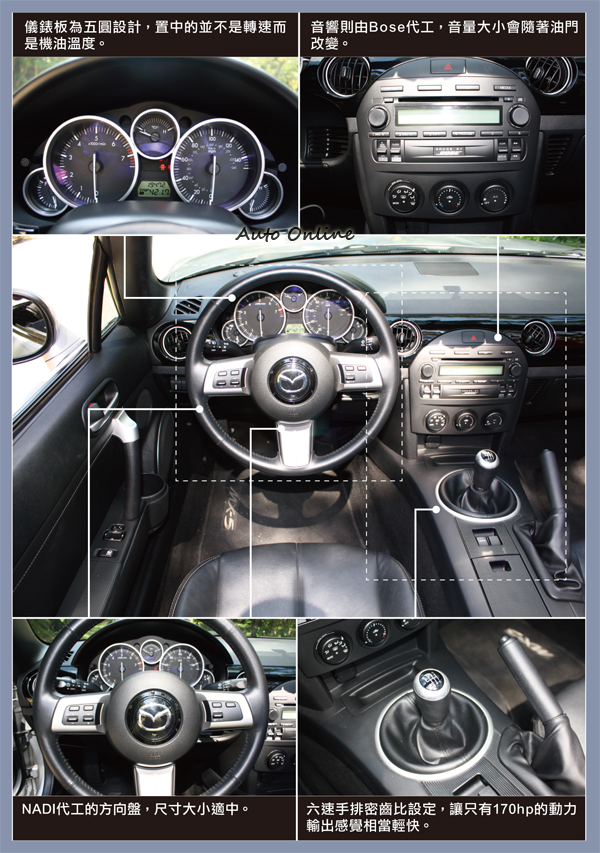座椅包覆性適中,過於激烈的操駕還是需要靠雙腳來支撐身體。五顆圓形造型儀錶板,位居中間的並不是轉速錶而是機油溫度,讓駕駛可以隨時監控引擎狀況。車內最奢華的應該就是Bose音響,Mazda MX-5一直以來都有廠商合作默契,MX-5的Sport版本避震器就會跟BILSTEIN合作, 方向盤則是NADI而音響就選擇Bose。音響會隨著引擎轉速自動調整音量,算是車內最高檔的奢侈品。
