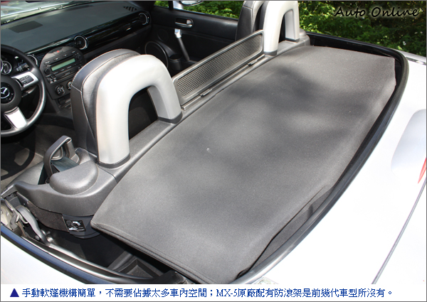 不過有點可惜的是2006年MX-5還是只有手動開關的軟篷,讓人有點惋惜,但喜歡傳統味道的車迷卻對手動開關篷機構讚不絕口,這樣設計不會有電動馬達來影響空間跟車重,在車輛車重配置會有更好的效果。但是以現在的科技還是用手動來開關篷聽起來感覺不太符合現況,喜歡電動敞篷的車迷請放心,在NC小改款後增加了電動開關篷設計,另外還有硬頂敞篷的MX-5供消費者選購。