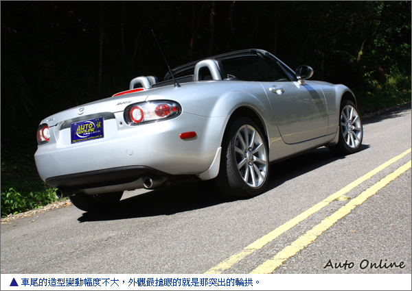 加寬的車身輪距原廠用誇張的爆龜來掩飾,讓圓潤的MX-5注入陽剛味。此車是從美國購入,為了符合美國當地法規在前保桿左右加裝橘色方向燈,有別於日規版本是在葉子板上安裝方向燈。車尾的造型變動幅度不大,從後方看最大的差異就是在後座原廠就配有防滾架,在前NA或者NB車型上需要車主自行改裝。