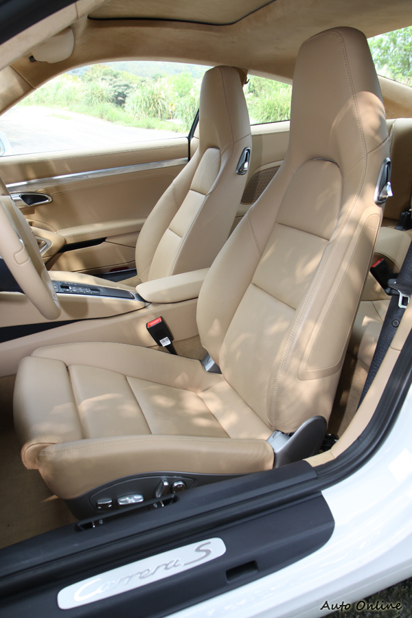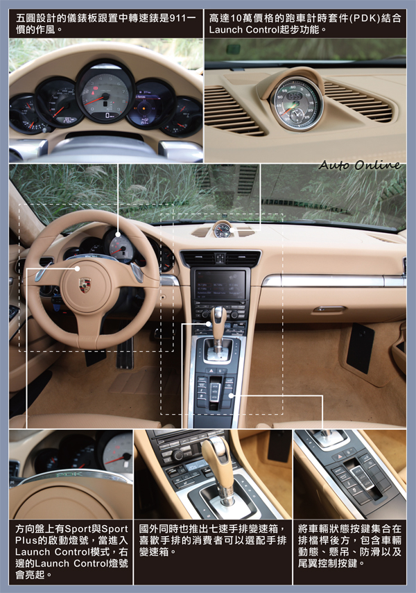 中控台上更大的7吋觸控式螢幕,雙區恆溫空調的控制按鍵,都能看到隨著時代演進的進步,坐在991車內讓人的感覺有像置身於Panamera上的舒適、豪華。但Porsche也不是一昧的只求改變,儀錶板五圓式設計、左側鑰匙孔設計,這些911的經典設計在全新991車型上依舊保存下來。