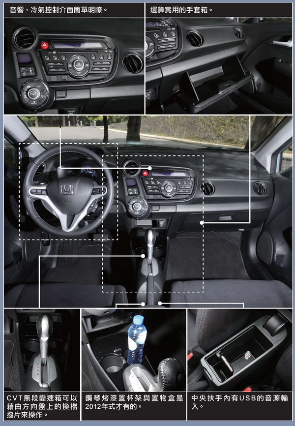 後座是這次車內的改裝重點,Insight在去年上市時就有消費者反應後座的壓迫感嚴重,Honda為了要徹底改進這項缺點,將2012年式Insight將後座椅墊削薄,頂棚也重新設計,椅墊跟頂棚改良後後座頭部可以增加約1.5cm的空間。改款前的Insight有後方視野不佳的缺點,主要原因是因為後行李廂飾板過於粗壯,而擋住了駕駛者後方的視野,2012年式Insight行李箱飾板重新改良,原本過於粗壯的飾板瘦身,改良後,後方的視野更加清楚不會被飾板遮住。