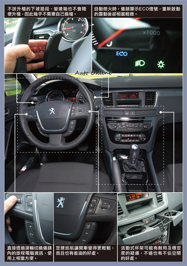 需要熟悉脾氣的自手排![]() ▲自手排變速系統必須透過油門控制才能獲得流暢的加速感,除非進入運動模式。首先看看它的車重,1476kg以這種等級的車來說算是正常水準,加速的衝勁比預期的好很多,不過確實比不上1.6 THP來得有勁。隨著熟悉車況之後,越來越能掌握它的油門反應,在一般模式下,除了每次換檔時的動力傳遞中斷讓人有點不耐煩,其餘並沒有太大的問題。翻開資料,原來這是508車系中唯一使用自手排變速系統的車型,難怪過去沒有這種感覺。經過來回測試後,發現PEUGEOT將這具六速自手排調校成模仿傳統手排變速箱的操作,也就是瀕臨換檔時必須先鬆開油門,等到跳檔後再接續油門動作,才能獲得流暢的加速反應。尷尬的是,駕駛要預測變速箱即將換檔的時機,對歐洲開慣手排的人沒有問題,但在台灣的市場,這並不是一種好事。 ![]() ▲旅程電腦具有相當多資訊,包括曲目、電台,甚至還能預設五組定速。![]() ▲不常用的控制鍵還藏在右下方的雜物盒內,相當特別。