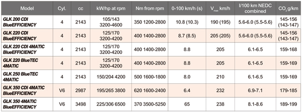 GLK仍有六速手排配置的車款,GLK 200 CDI與GLK 220CDI BlueEFFICIENCY這款沒有搭配4MATIC的後輪驅動車款更為省油,每百公里只須5.5到5.6公升的柴油。動力最優異的柴油款是GLK 350 CDI 4MATIC BlueEFFICIENCY,儘管動力增加了25kW(35hp),油耗仍有每百公里6.9升柴油的實力。