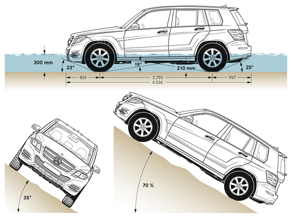 ▲GLK越野性能圖示:側傾可達35度,並可攀上70%的坡道。