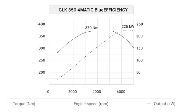 汽油引擎方面,GLK 350 4MATIC BlueEFFICIENCY為V6配置,3498cc排氣量,最大馬力達306hp/6500rpm ,最大扭力則有370Nm/3500-5250rpm,詳細的各車型引擎表現如下表: