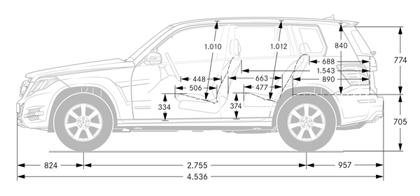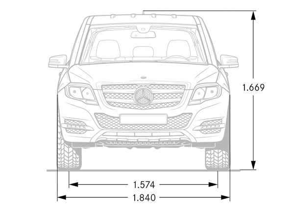 GLK車身最低離地高度為21公分,前懸824mm,後懸957mm,使得GLK的越野進入角達23度,離去角達25度,前輪到車身中央的斜坡角達19度,車體最大側傾角為35度,可攀爬最高達70%的斜坡,整體來說,2755mm的較短軸距以及相對較輕的1845kg車重,GLK的越野性能並不會輸給M-Class太多。