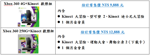 年過年最棒的娛樂就是連續Xbox派對開不停,台灣微軟將自1/28起推出「Xbox小龍迎豐年」限定開運好康,針對最熱門的多款焦點遊戲推出組合優惠,包含:「天王對戰組」、「競速活力組」以及「熱舞甩油組」,原價NT$ 2,580~3,580元不等的遊戲組合限量折扣優惠,最高多達五折,讓消費者最多現省1,592元。同時,台灣微軟同樣推出主機相關優惠,Xbox 360 4G + Kinect 歡樂組估計零售價NT$ 9,888元、Xbox 360 250G + Kinect 歡樂組合估計零售價NT$ 12,888元,均加送三款遊戲及一個月Xbox LIVE金會員,於2/20前購買並上網登錄還有機會抽中全家三人同遊香港迪士尼樂園!