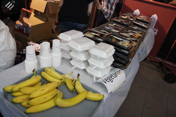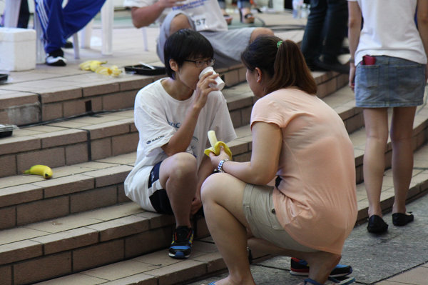 ![]() ▲每一輛車依序輪流休息,時間一到,如同逃難般奔往休息區,動作一氣呵成,邊按摩邊吃便當,絕不浪費時間。選手每六小時可以休息5分鐘11秒(因為第11屆緣故),期間可用餐、水果、按摩或上廁所。第一次休息時間在晚間七點來到,台灣剩下的九位選手把握時間狼吞虎嚥,隨即繼續苦戰。 ![]() ▲除了便當,還提供富含鉀的香蕉用來紓緩肌肉酸痛,只要有時間,吃幾根都沒問題。![]() ▲台灣唯一女性參賽者方琬虹趁著短暫休息時間,親友幫忙收集食物、塞食物,鬥志相當高昂。