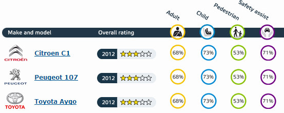 車壇中著名的迷你車三胞胎:PEUGEOT 107、CITROEN C1和TOYOTA Aygo,最近小改款車型都在EuroNCAP進行撞擊測試,但全都只獲得3顆星的評比,這比當初2005年新車剛推出時的4顆星還慘!顯然這些車的安全防護能力,還是停留在七年前相同的水準,一點都沒有長進。