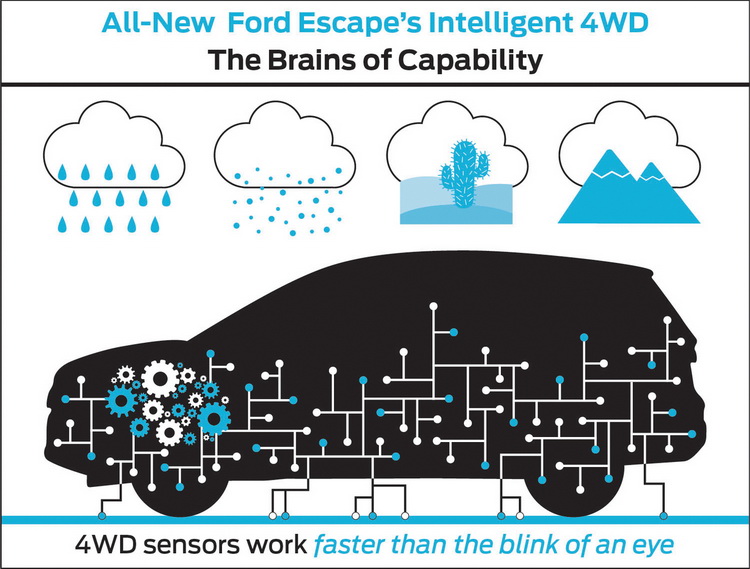 全時四輪驅動All-Wheel-Drive (AWD)車款在北美市場正夯,而福特汽車不僅在四輪驅動系統技術佔有領先地位,更引領這股全驅潮流。自2009年以來,福特具AWD功能車款的銷售成長超過72%,領先業界同期成長速度達19%,而在2012年,北美市場的銷售中,每五輛便有一輛是AWD車款,足見AWD在美國受歡迎程度,此外,福特近年來在全球市場發表多項另人耳目一新的綠能與智能科技,並應用於旗下多款全新休旅車款中,展示福特在休旅車造車工藝的成就及其領導地位。