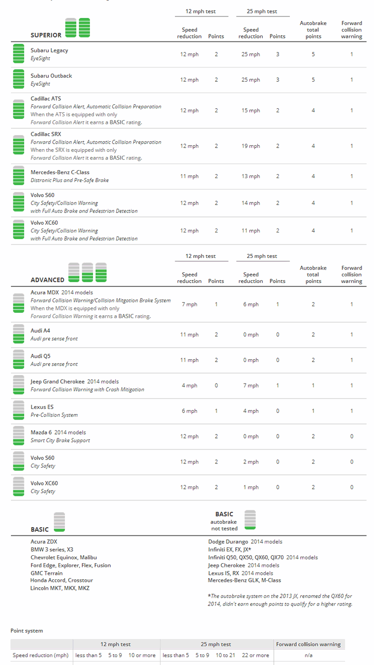 史上頭一遭的碰撞避免系統評比結果已由美國IIHS率先公佈,在在74款受測車中,只有7款車得到最高等級的“Superior”評價,6款車拿到次等的“Advanced”評價。此外,TOYOTA Prius v也因為所宣稱的碰撞避免系統根本不符合NHTSA最基本的要求,遭到直接除名的命運。