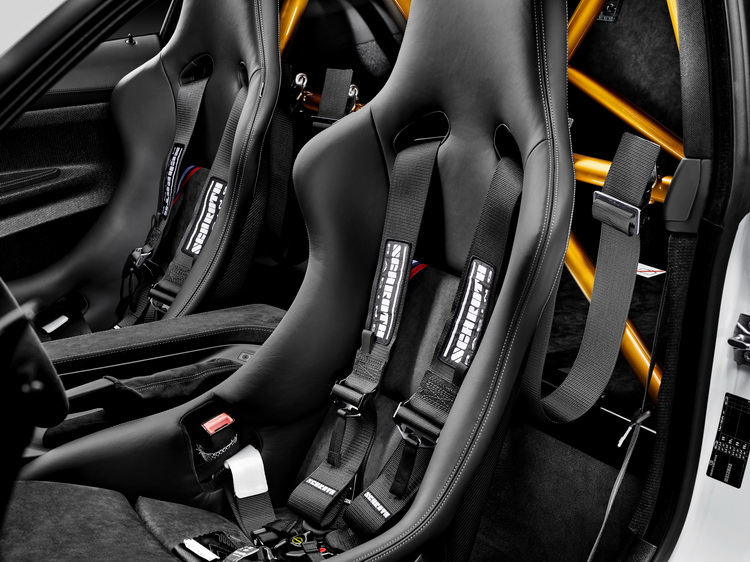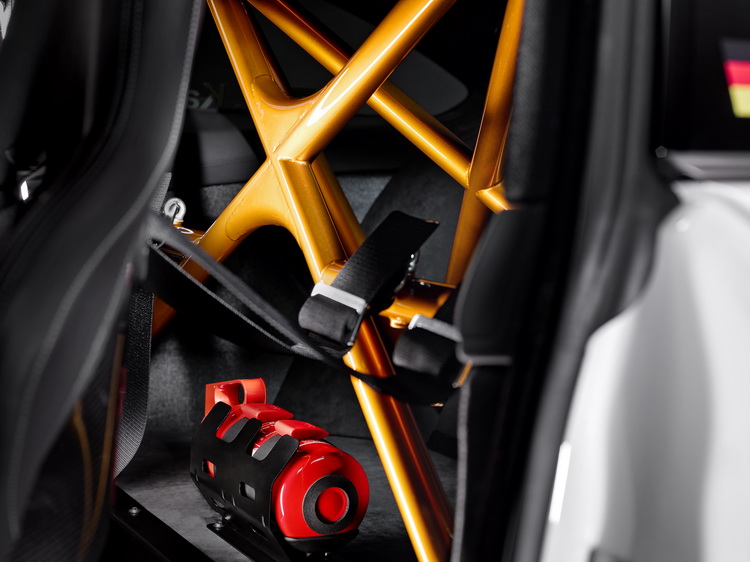 而在空力性能的強化上,換上大型的專用碳纖維角度可調式後擾流尾翼與前下擾流,前保桿三個進氣壩開口面積加大,讓空氣的進氣達到最佳化並抑制對前軸造成的升力。腳下所配備了輪胎則是前:265/35R19、後:285/30R20的米其林Pilot Sport Cup 2賽道用跑車胎。在鋁圈與前下擾流都加上橘色來凸顯視覺。懸吊也換上賽道專用的版本,配合各賽車場不同的賽道特性,可以做三段式調整,煞車則為碳纖陶瓷複合材質。