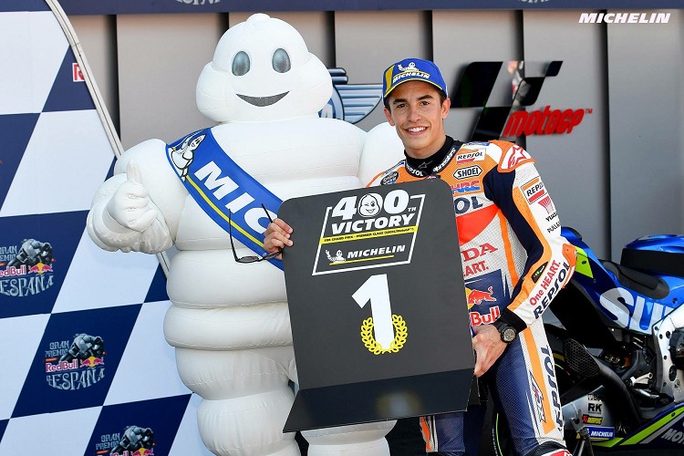 MICHELIN在開放輪胎時代與無數家輪胎廠商在最高級別競爭,直到2008年的最終站Catalunya,由Dani Pedrosa拿下勝利。MICHELIN的連勝在那之後被迫被賽會連續7年的統一輪胎規定打斷。在1973至2008年這段期間,MICHELIN在500cc/GP級距中取得驚人的73%勝率的好成績,幫助Honda, Yamaha, Suzuki, Cagiva拿下勝利,也幫助Sanvenero車手Michel Frutschi在1982年法國站拿下僅此一次的冠軍。MICHELIN的連勝在2016年回歸MotoGP成為官方指定用胎後繼續。自此之後拿下了連續40場勝利,包含Marquez在週日所取得的勝利。同時,Ducati也成為了使用MICHELIN輪胎贏得勝利的車廠之一。MICHELIN與MotoGP的合約將至少延續至2023年,因此有極高的可能性這間法國輪胎廠很快就將迎接第500次的勝利。