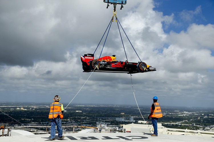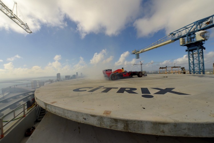 紅牛Red Bull機能飲料一直以來都是極限運動的主要贊助商,而F1賽車運動更是其最大資源運動項目,每次在不同分站開始前夕,都會推出令人驚豔的推廣影片。這次他們在美國分站時,將2011年的冠軍車RB7吊掛到700英尺高的邁阿密1000博物館大樓頂部(One Thousand Museum Tower),於直升機停機坪上做出甜甜圈燒胎畫面,驚人之舉已讓這支F1車隊帶來驚人氣勢。