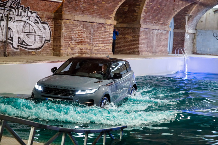 而當他遇到塞車,瀟灑地掉頭走「捷徑」進入隧道時時才是好戲的開始,傑米駕著Range Rover Evoque輕鬆涉水通過裡面的水池,也輕鬆跨過大角度的障礙斜坡,還透過虛擬車底透視系統讓車子從容地在鐵軌上保持直線前進。車內後視鏡也可以變成高畫質螢幕顯示不受遮蔽的後方視野,Range Rover Evoque的產品亮點短短幾分鐘完整呈現。