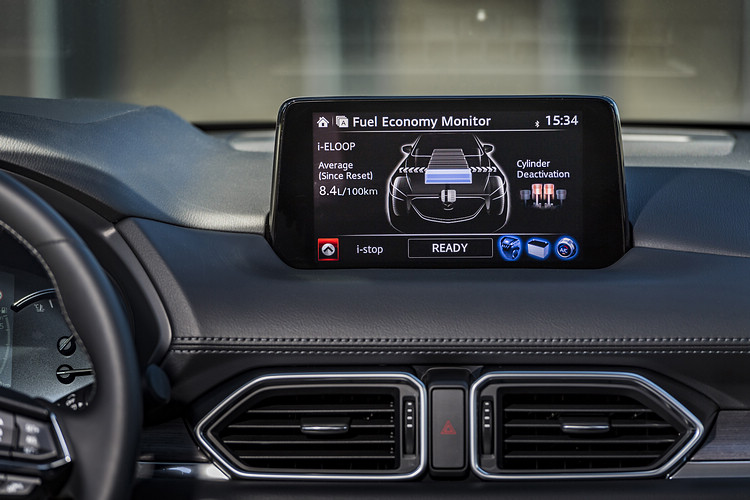 ![]() ▲座艙以更高質感的座椅內裝配置,以及8吋顯示幕的導入,提供更優質的操作體驗。歐規新年式CX-5 Skyactiv-G 2.0手排車型新增搭載汽缸休止技術,藉以改善其油耗表現,駕駛並可透過中控螢幕檢視即時的動力系統運作狀態。 ![]() ▲除了配置新設計的8吋顯示幕,內建功能也一併升級。