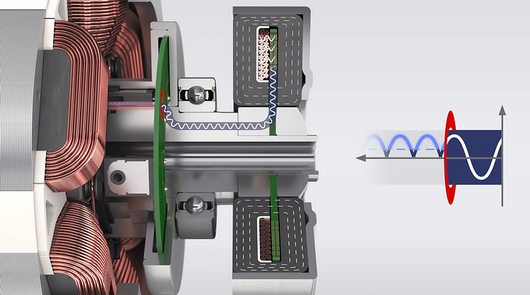 ![]() 不使用永磁體的馬達,基本原理是藉由電磁力讓轉子旋轉,從以上的案例看來並不是什麼新奇的技術。不過這通常有個問題,那就是運動中的轉子仍然必須與銅線纏繞的感應線圈實質接觸,才能達到傳輸電力的目的,而此刻接觸點就成了可能造成磨損的關鍵點。
