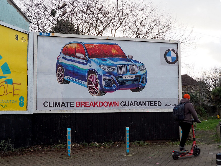 包括Subvertisers' International、Brandalism和Extinction Rebellion在內的公民組織,在歐洲地鐵車廂等處設置一系列的創意看板,將矛頭指向BMW、Toyota等汽車製造商,抨擊車廠過度美化燃油車的相關作為。