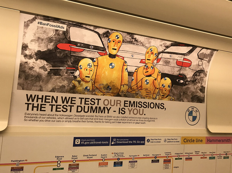 一則位於倫敦地鐵的廣告寫著:「當我們測試排放時,測試假人就是您」、「感謝您參與我們的健康實驗 」。廣告中並指出BMW和Volkswagen一樣,都在排放測試中安裝作弊的設備。