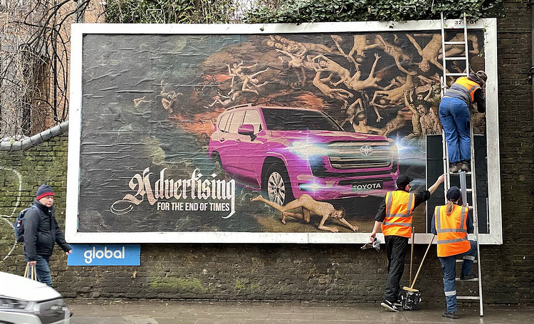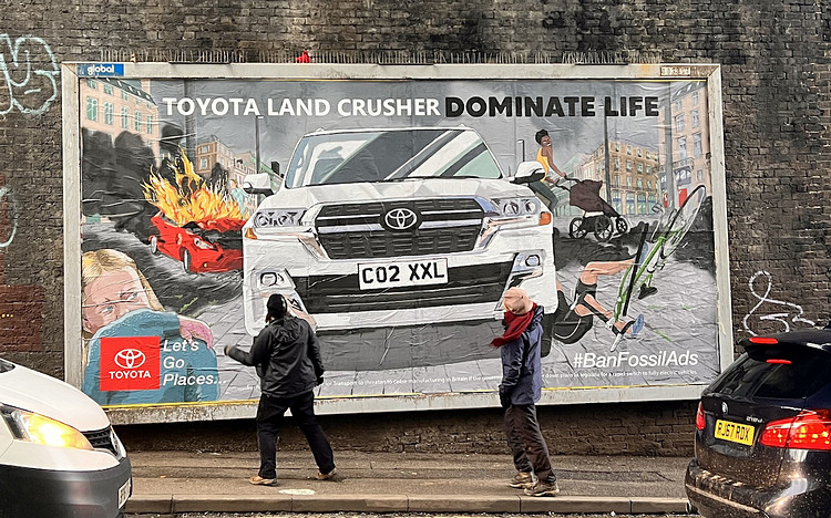 即將卸任的Toyota首席執行長豐田章男,由於對電動車抱持懷疑態度,也成為各大環保抨擊的主要目標。有一看板將他塑造成惡魔奸惡形象,並以「SCREW THE CLIMATE!」作為標題。另有廣告看板點出Toyota“洗綠”品牌作法可議,指其淨零口號極具誤導性,意圖使人忽視營利來自於99.8%燃油車銷量的事實。