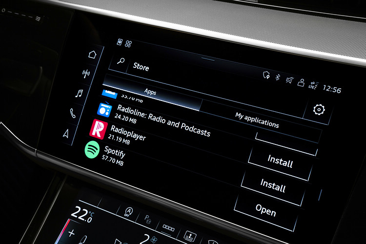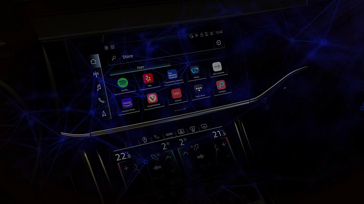 透過Audi應用程式商店的更新以及MIB 3硬體的升級,第三方App可直接獨立地自手機下載至MMI,使用者得以使用想要的音樂、影片、電玩、導航、停車、充電、生產力、天氣和新聞等應用程式功能,包括Amazon Music和Spotify在內,以及物聯網家居設備管理等功能。商店提供的App也會持續擴增,車主可自行從MMI選單內進行下載,所提供的應用程式會因不同國家地區進行調整。