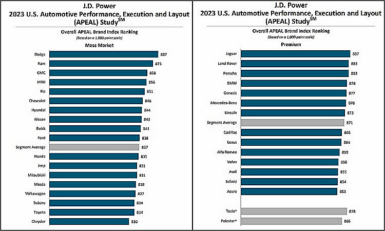 美國權威機構JD Power每年都會公佈APEAL(汽車性能、執行與布局研究)新車魅力指數的調查結果,今年2月至5月期間,該機構針對84,555名在2023年購買新車並使用超過90天的車主進行問卷調查,調查車主對於新車的喜愛程度、駕乘舒適感受、資訊娛樂系統、動力表現和駕駛樂趣等多達37種面向的實際感受,然後予以加總評分。