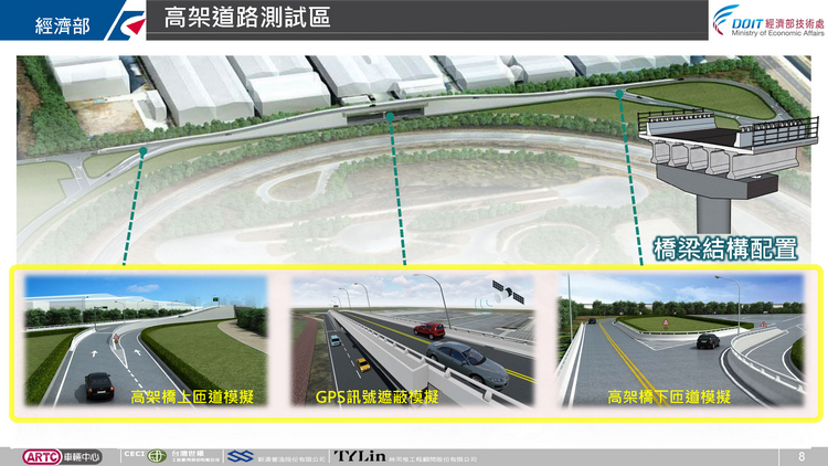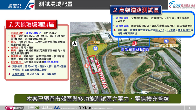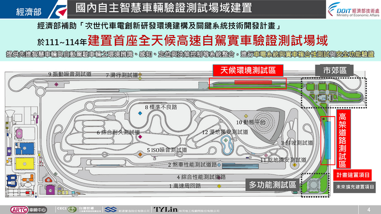經濟部今(31)日於彰化財團法人車輛研究測試中心(簡稱車輛中心)舉辦動土典禮,斥資10億元興建國際級智慧車電驗證環境。其中全臺首座全天候高速自駕驗測場域,可提供大型巴士在超大豪雨、濃霧、隧道或高架橋等行車情境下,執行最高時速達110公里之自動駕駛實車驗證測試。加上陸續完成智慧座艙及電動車動力總成等驗證測試能量後,預期可執行千次以上測試案並創造超過百億以上產值,2025年完工後將可大幅加速我國自駕科技研發速度。