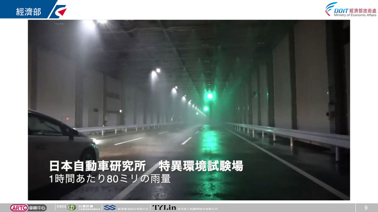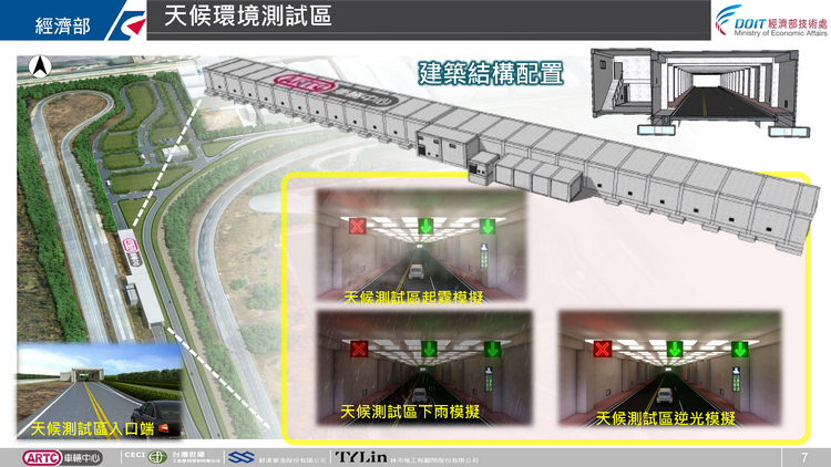 提供全天候、全車種、全速域的測試驗證服務 助攻產業 在全天候高速自駕實車驗證測試場域,可提供智慧車輛、車輛電子系統、感知系統等產品,在降雨、起霧、日出日落或夜間等天候境條件下,進行系統辨識、邏輯判斷等情境測試。在降雨部分,每小時降雨量可達到100毫米以上,實現中央氣象局所訂定超大豪雨等級,車速最快可達時速110公里,讓各型車輛可於長200公尺的隧道內,進行雙向測試,不論在測試車速、降雨量及降雨涵蓋率的設計,均參考日本JARI、德國CARISSMA等國際專業機構建置。在3D高架道路驗證測試場域,可測試智慧車輛於匝道的匯入匯出情境,及在高架橋與橋下道路供雙層巴士等大型車輛的GPS訊號遮蔽測試。