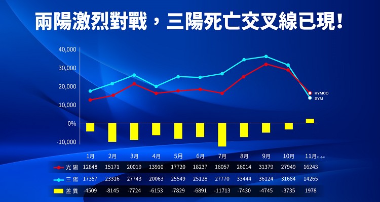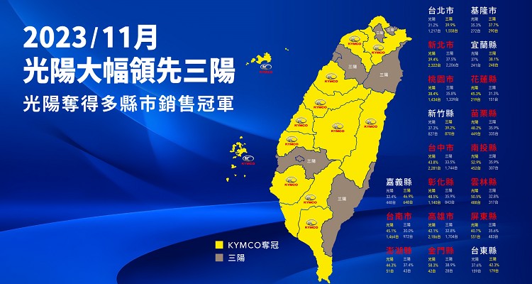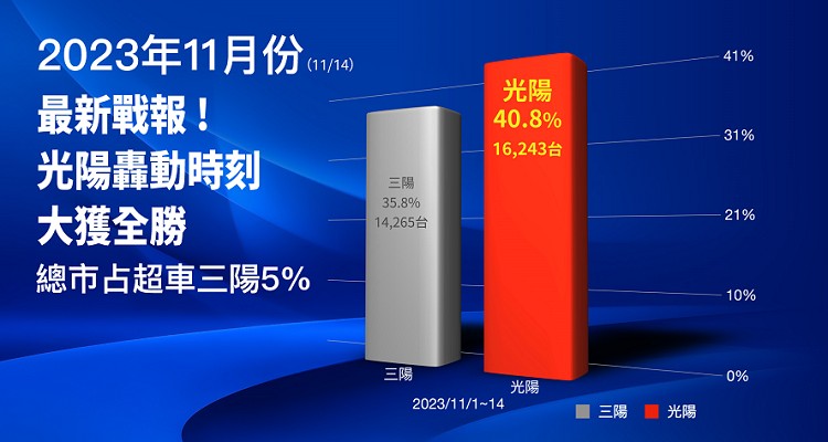 多點佈局的搶市策略、使KYMCO的品牌氣勢旺到最高點,與同業競爭白熱化。市占率一路纏鬥,緊縮彼此差距,讓光陽11月上半月以16,243輛銷售台數領先同業5%,在14天內平均市占達到40.77%!隨著狂銷全台的GP125穩定交車、四大款轟動新車口碑持續發酵,從9月、10月只是拉近成績差距,光陽目前在市占率保持領先超越同業;正常狀態下,有機會在各界期待下於11月超車同業,獲得機車市場的冠軍,讓光陽喊出的2024年雙料冠軍目標能再進一步,穩步前行。