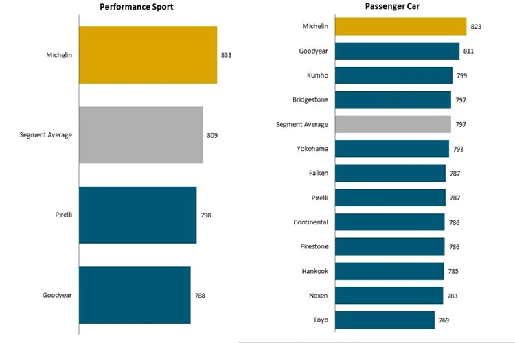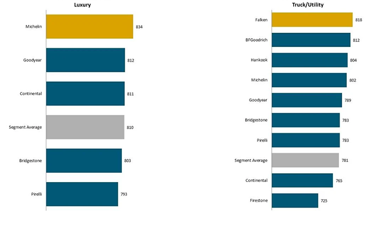 根據J.D. Power調研機構最新公佈的「2024年美國汽車原裝配胎客戶滿意度」報告,Michelin在豪華車、乘用車和性能跑車等三個類別的滿意度都名列第一,Falken則在多功能車類別中最受到車主肯定。J.D. Power表示,儘管電動車本來就會因為較重的車身和更高的扭力,導致輪胎磨耗速度更快,許多車主似乎無法理解或不願接受這樣的事實,依然期待輪胎壽命能有和燃油車同樣表現,進而影響了電動車輪胎的整體滿意度。