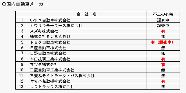 日本國土交通省證實Toyota、Honda、Mazda、Suzuki和Yamaha多款車有性能及安全測試造假事實,其中涉及重大的Toyota總部更不尋常地遭到官方進入調查,同時國土交通省已下令其中三家車廠生產的六款車型即刻暫停生產。
