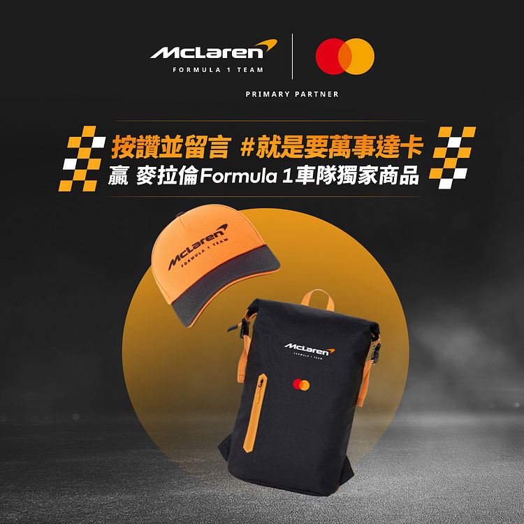 ![]() 作為麥拉倫Formula 1車隊的官方主要合作夥伴,萬事達卡將品牌無縫融入賽道體驗,並將上海國際賽車場內的麥拉倫貴賓室 (McLaren Lounge)升級為麥拉倫無價貴賓室 (McLaren Priceless Lounge)。除了賽道上的精彩活動,萬事達卡也邀請台灣賽車迷透過社群媒體參與互動抽獎,只要關注萬事達卡Facebook粉絲專頁,並於指定活動貼文按讚與留言,即有機會贏得麥拉倫Formula 1車隊周邊商品。