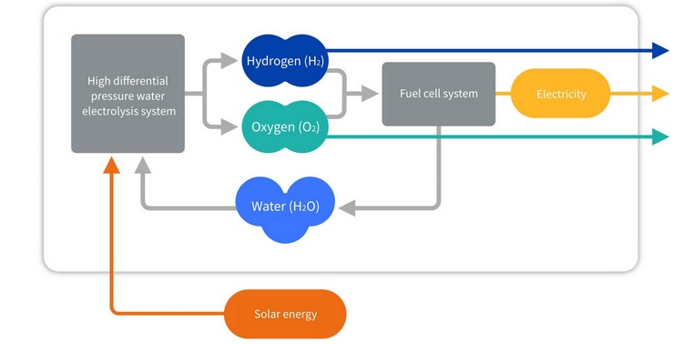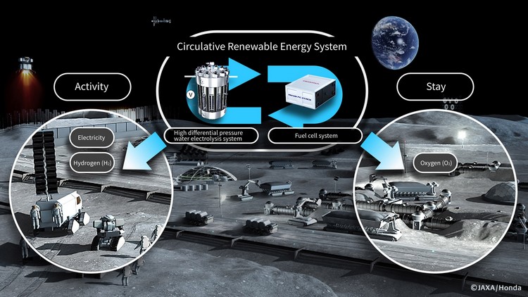 Honda這套RFC循環再生能源系統系統,是利用太陽能和水持續生產氧氣、氫氣和電能。在月晝(相當於地球的29.5天)期間,RFC系統將太陽能儲存為氫氣,並在月夜(相當於地球的14天)將其轉換為電能。除了電力,燃料電池只會生成水,而水則會被循環導回高壓水電解系統,形成封閉能量循環。