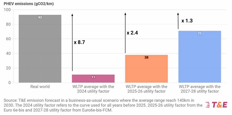 ![]() T&E指出,歐盟現行WLTP法規的計算方式有瑕疵,因為它是假設PHEV約有84%的行駛時間以純電模式運作,但實際數據僅約27%,這種過於樂觀的假設導致推算出來的排放量與油耗大幅高估。按照WLTP的標準,PHEV的純電續航里程會決定其效用係數 (純電模式佔總行駛里程的比例),UF),而效用係數又定義了假設的電量耗盡(CD)模式的駕駛佔比;當純電續航里程越高,假設的CD模式佔比就越大,官方公佈的二氧化碳排放量就會越低。然而,續航里程與排放量之間的關聯性,實際上遠比WLTP測試方法所假設的還要少很多。即使未來修正效用係數,預估實際排放仍會比標示值高出近兩成。 ![]() ▲現行˙WLTP測試假設的效用係數被指稱與現實嚴重不符,歐盟因此未來將會調整UF係數以貼近實際狀況,然而T&E認為,以電動續航里程來預測PHEV的排放量會造成嚴重失準。由於大多數插電式混合動力車不具備快速充電功能,車主因此降低為車輛定期充電的意願。T&E因此建議政策必須明定出PHEV的規格及性能限制,譬如:車輛必須具備快速充電能力,並相容於100kW以上的直流充電;電動馬達的功率必須至少是內燃機的3倍;2030年在純電模式下的續航里程至少必須達到200公里;油箱容量應限制在15公升以下,以鼓勵駕駛使用純電模式。 T&E同時呼籲歐盟應堅守原訂排放修正時程,並加強實際道路監測,避免PHEV成為汽車業合規工具而非真正的低碳解方。