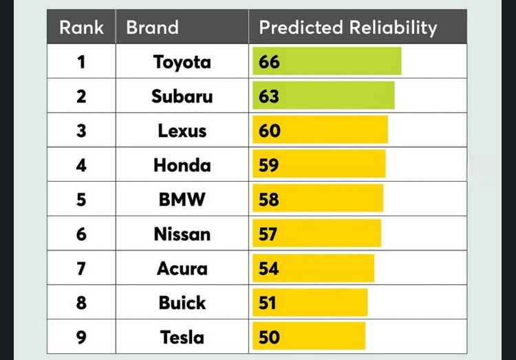 在可靠度光譜的另一端,表現最優異的是 Lexus 與 Toyota,分別拿下 77 分與 73 分。第三名則是明顯落後一段距離的 Mazda,評分 58 分。Honda 與 Acura 以 57 分與 53 分分別排名第四與第五。完整結果如下: