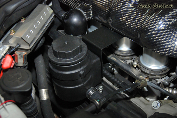 ![]() ▲這角度可以明顯看到M3 V8引擎的八喉直噴歧管。機械增壓的原理是靠引擎運轉藉著皮帶來帶動機械增壓本體,跟渦輪增壓靠引擎廢氣帶動不同。車主為愛車選擇ESS E92 M3 VT2-625的機械增壓套件,套件包含機械增壓本體、管路、水冷式進氣冷卻器、加大噴油嘴、獨立冷卻器、獨立的水幫浦以及電腦等等。 ![]() ▲碳纖維飾板下藏著水冷式的進氣冷卻器。![]() ▲進氣冷卻為水冷式設計,有獨立的副水箱以及水幫浦。![]() ▲進氣香菇頭裝在保桿原霧燈位置,冷卻水冷式進氣冷卻器的Cooler同樣裝在保桿內。