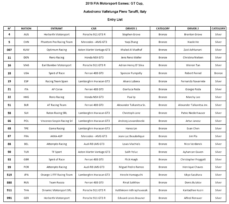 即將在11月1-3日舉辦的第一屆FIA Motorsport Games(賽車世運會),共有六個單項競賽,由於這項賽事比照奧運,參賽者是以國家及地區為單位而非傳統車隊,中華賽車會也搶在第一時間報名參賽,預計將會參加其中的GT Cup和電競賽車。其中GT Cup會派出職業車手陳意凡和業餘車手林帛亨的雙人組合參賽,在Lamborghini Taipei嘉鎷興業的支持下,將以「中華台北」的名義和其他21個國家地區爭奪首屆世界冠軍。