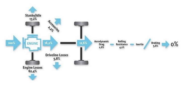 ▲這張示意圖顯示出一般公路駕駛中燃料能量的利用與消耗,顯然,內燃機的效率是其中最大關鍵。