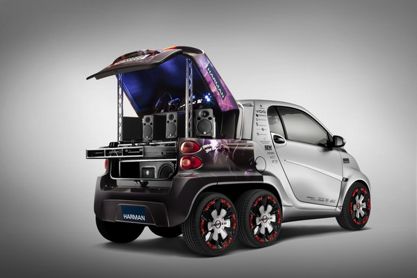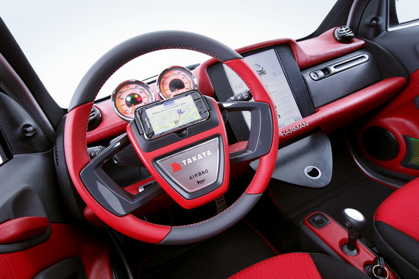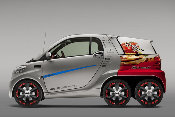 ![]() 這次的Dock+Go概念車是以SMART的 Fortwo電動版車型Fortwo ed為基礎所開發,特別在目前電動車續航距離不長這個問題上提出了他們的設計思維。它在車子後方連接一節有如拖車般的車體,與不同車體的搭配可以讓它變身為小貨卡或小休旅車型。這節車體中內藏「電池包」,裡面不僅有鋰離子充電電池,也可以搭載燃料電池或發電專用引擎(Range Exrender)等不同形式的輔助電源。從這次所公開的廠照可以看出,Dock+Go是以都會區披薩外送這類宅配工作作為主要用途設定。