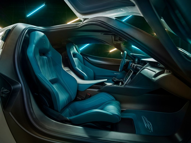 車室內裝飾純手工打造,透過消光碳纖維飾板鋪陳營造與藍色真皮內裝的反差。中控台配置大型顯示幕,駕駛者前方也是數位化儀,副手座前方還另有小型顯示幕。