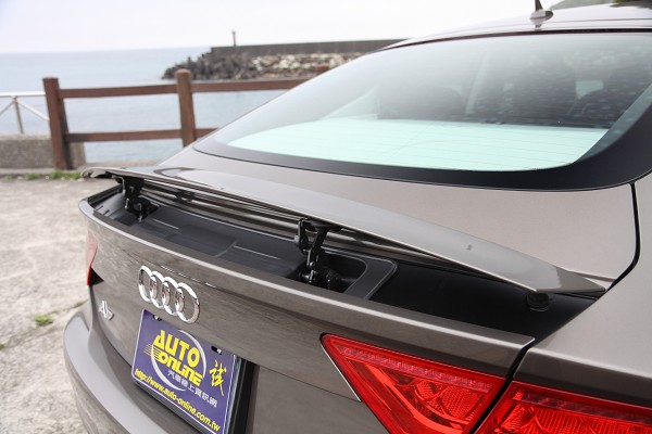 全新A7的車側曲線絕對是最吸引目光的部分,從A柱開始向後延伸至C柱,巧妙將雙門跑車的動感融入其中,並完美與車尾的掀背尾門結合,造型設計概念源自1969年推出的經典掀背車款Audi 100 Coupe S,重現40年前引領當時設計潮流的絕代風華!此外,全新A7也具備了出色的空氣動力學性能,隱藏在掀背尾門末端的自動升降式後擾流尾翼,當時速超過130km/h時後擾流尾翼即自動升起,一旦車速低於80km/h則自動降下收納,駕駛者也可透過車內中控台上的控制按鍵自行調整後尾翼的升降模式。