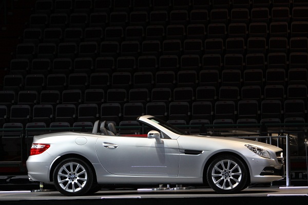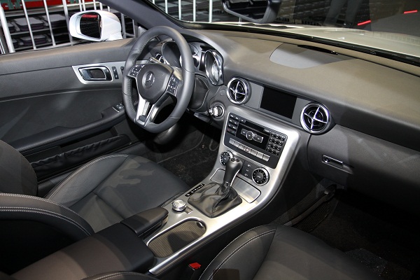 SLK的電動車有傳統鋼篷與染熱採光車頂。整個關篷的時間僅需20秒。而染色車頂採用輕量化的聚碳酸酯材質,可節省車頂重量30%。這個原廠稱之MAGIC SKY CONTROL的車頂原理其實就是在車頂注入電磁分子,可透過分子排列的改變來決定陽光穿透的程度。透明模式陽光的熱能可達200左右,而變色之後熱能則可降至40~50W。