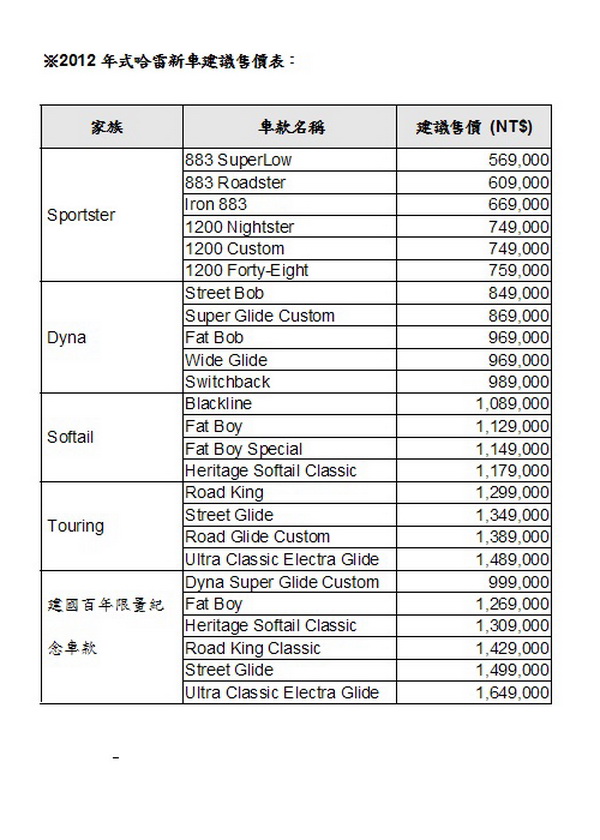 Harley-Davidson總代理太古鼎翰預計將從本月23起於北中南三地展開2012年式的新車賞車會,Harley-Davidson旗下四大家族包括Sportster、Dyna、Softail、以及Touring將近20餘台新車一字排開聲勢十分浩大。
