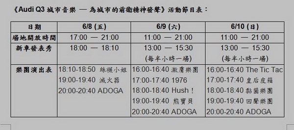 ![]() Audi原廠設計團隊賦予Q3對於「效能」(Efficiency)和「空間」(Space)的全新定義,加上Q3徹底突破傳統LSUV格局的外型設計,均呼應「進化科技、定義未來」的品牌核心價值,而為了展現Audi Q3所代表的未來性和科技性,台灣奧迪汽車預計將以別開生面的方式,為Q3量身打造前所未見的創意行銷體驗,舉辦《Audi Q3城市音樂節─為城市的前衛精神發聲!》活動,其自6月8日至6月10日止,假信義區A13廣場(新光三越A11旁停車場),歡迎所有喜愛Audi的朋友們引領感受Q3所獨創的城市新魅力!