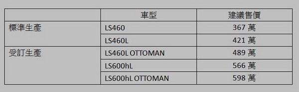 LEXUS七月底在舊金山發表了品牌豪華旗艦LS車系的小改款車款,11月13日也正式發表引進國內。本次LS全新改款,在6,000多個關鍵零組件中高達3,000多個重新設計製作或精密調校提升性能,從內而外煥然一新,不論設計、質感或性能,都呈現讓人驚豔的全新風貌。 本次LS全新改款從底盤懸吊的精密調校、豪華座椅舒適質感再升級、外觀內裝導入重新家族設計…等,每一個細節都展現出LEXUS極致的造車工藝。 2013年式LS共有5個車款:LS 600hL、LS 460L兩個長軸車型、LS460標準車型、以及LS 600hL Ottoman與LS 460L Ottoman兩個長軸Ottoman車款,售價請見聞末價格表。