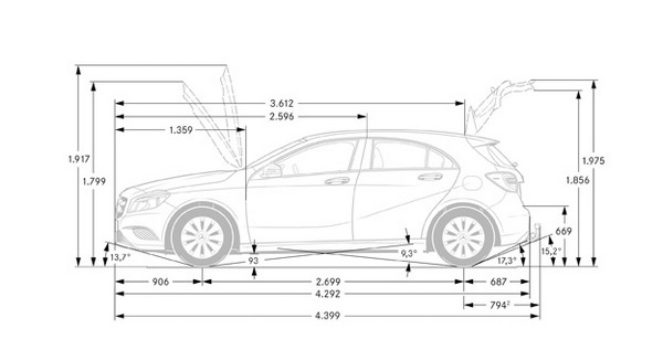 M-BENZ A-Class車身尺碼長寬高4,292mm x 1,780mm x 1,433mm,軸距則為2,699 mm,外型不僅融入家族車格,更打造別具一格的熱血性格。車頭水箱罩依據不同車型會搭配鍍鉻雙柵或是鑽石型單柵設計,整合精密的下擾流造型,讓車頭視覺效果更為低趴。頭燈組具備鏢型LED晝行燈,車側線條部分,更打造出緊實的弧度車頂,光影切面令車身線條更為俐落而動感。