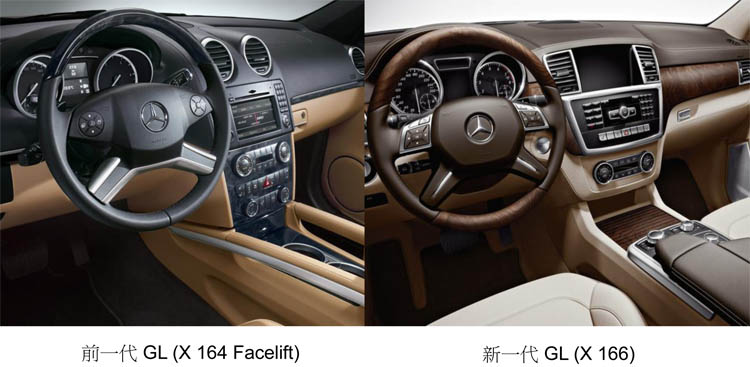 ▲前後兩代車型的內裝比較,其中新GL高度電子化的科技配備讓車室更賦予科技感,也讓中央扶手區域的空間更加簡潔。