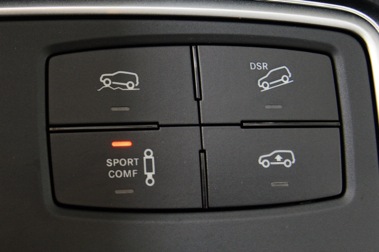 ▲左上鍵為越野模式鍵,右上鍵是下坡速度控制系統鍵,另有不同模式懸吊軟硬控制及車身高低控制功能。