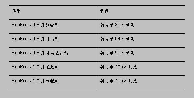 福特六和汽車7月11日於高雄義大世界皇家劇院發表全新休旅車系THE ALL-NEW KUGA,所搭載之先進科技與安全配備為休旅車市場樹立全新高度,在1.6升與2.0升EcoBoost兩具渦輪增壓缸內直噴汽油引擎下,此次福特規劃出5大車型供台灣消費者選擇。售價依序開出1.6升雅緻型88.8萬、時尚型94.8萬、時尚經典型99.8萬。2.0升運動型109.8萬、旗艦型119.8萬。