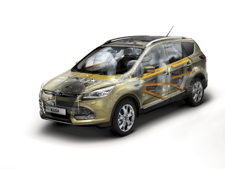 在車身尺碼設定上,THE ALL-NEW KUGA採用與FOCUS相同之全球戰略中型房車平台打造,休旅身型顯現相當氣勢,特別在軸距上領先同級,放大至2,690mm,長、寬、高為4,524mm x 1,838mm x 1,685mm。外在車身造型則承襲著福特Kinetic Design動能美學設計語彙,線條流暢且充滿肌理分布。特別引人入勝的車頭設計,以橫式鍍鉻水箱護欄搭配下方大開口式進氣壩,霸氣姿態油然而生。三份切割的進氣壩,在左右兩側巧妙安排霧燈、方向燈等。銳利的晶鑽式鷹眼頭燈線條亦與四周線條起伏完美配合,最後隨著高聳的肩線一路拉曳至車尾燈組處。